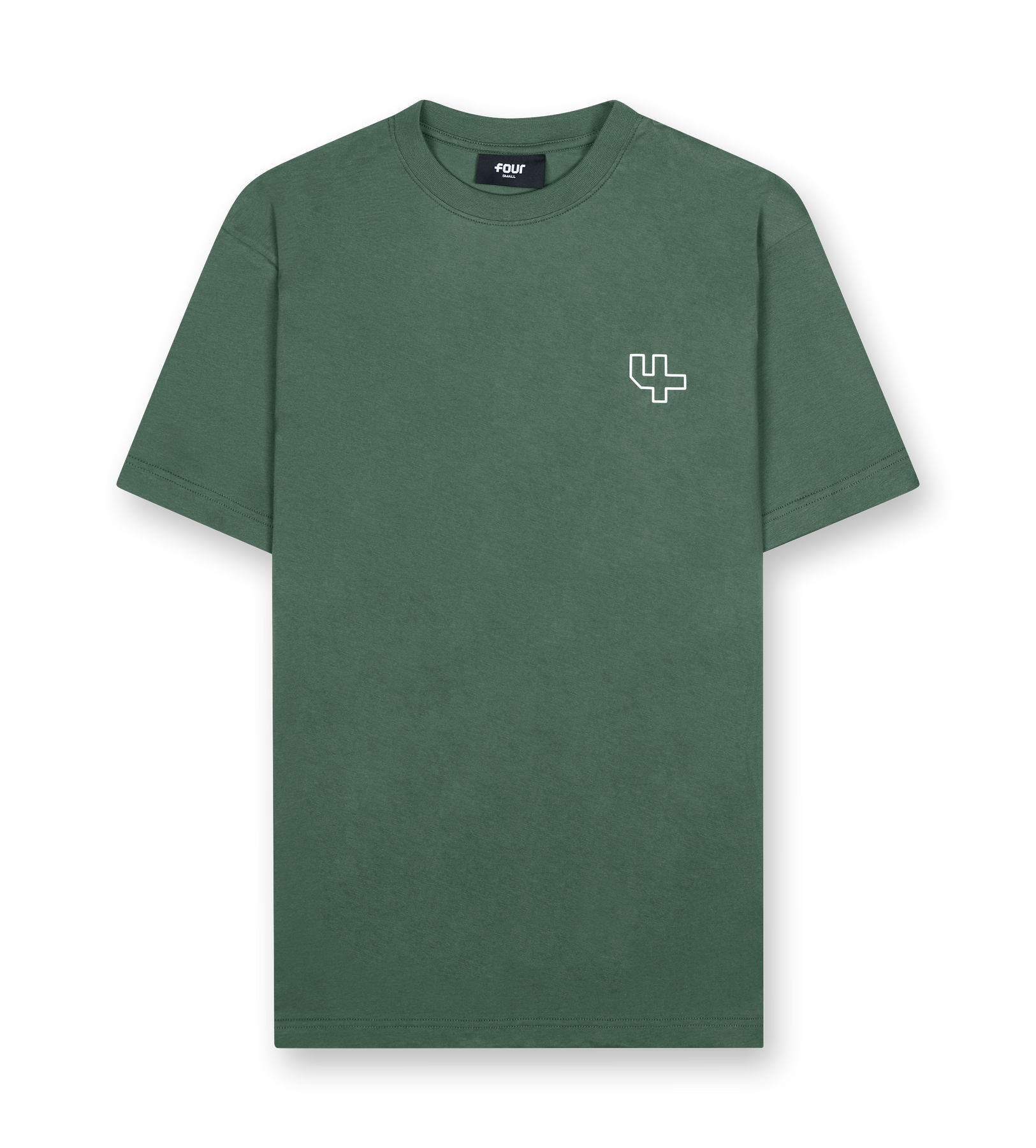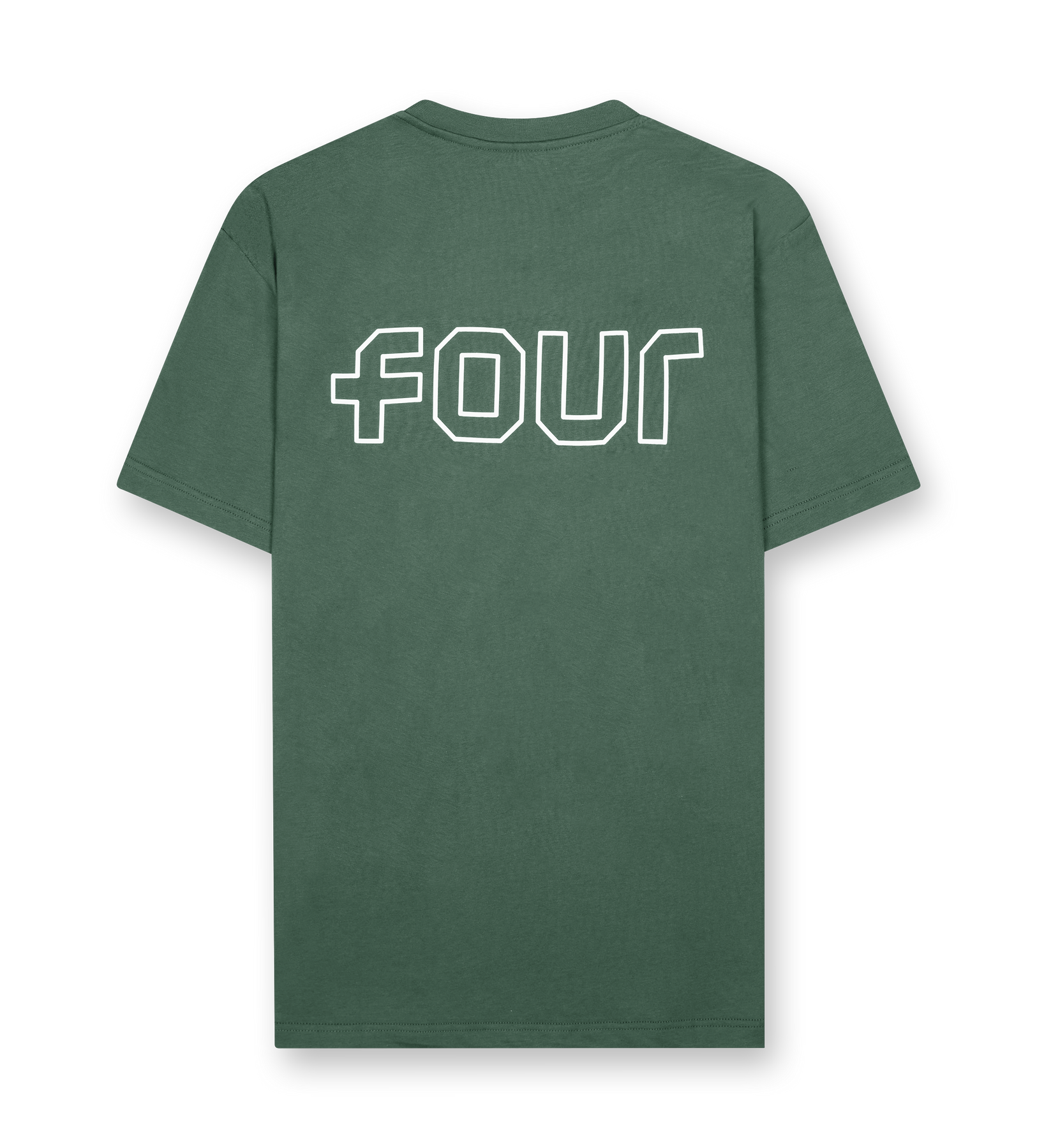 An oversized single-jersey T-shirt with a relaxed silhouette and a clean outline-logo design. The deep-forest tone gives the piece a refined everyday look, complemented by the small chest logo and the large FOUR artwork on the back.